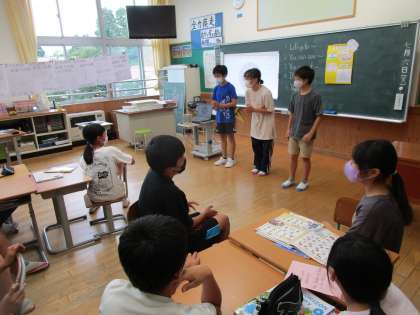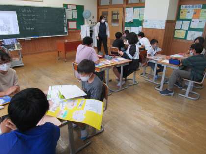 世界の国の食べ物や観光地を紹介するポスターを作り、英語で発表しました。難しい表現にも挑戦しています。