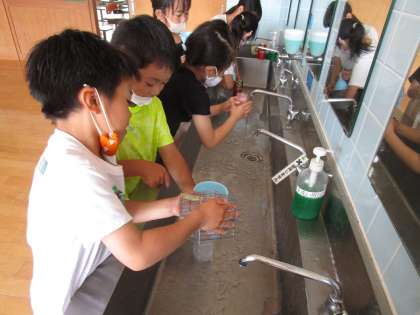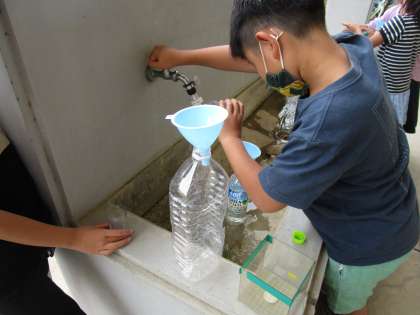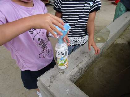 1リットルますや1デシリットルますを使って、ペットボトルに入る水のかさや、1リットル=10デシリットルであること等を確かめました。「600ミリリットルは、5杯になるはず」「22杯も入った」と、慎重に水を測りこぼさないように入れ替えていました。