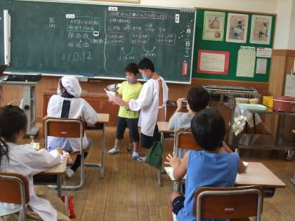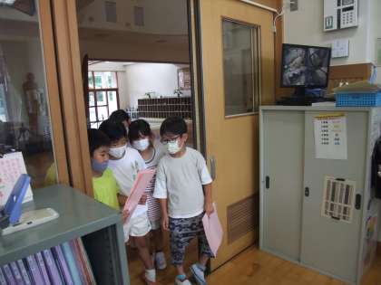 1年生は明日全校を招いてにじいろあさがおパーティーを開きます。今日は全校に招待状を渡しに行きました。
