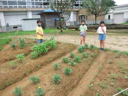 休み時間に花壇を見ると、マリーゴールドの花が咲いていました。あさがおだけでなく、育てている他の花もぐんぐん成長しています。