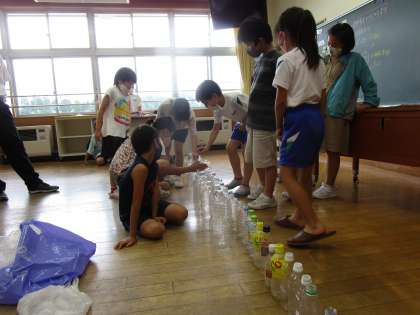 社会科 水はどこからの学習で、1日1人あたり330リットルの水を使っていることを知った子供たち。先週の金曜、各家庭からペットボトルを集めて、水の使用量を確かめることにしました。ペットボトルにして660本・・・を集めることは難しかったのですが、約100本のペットボトルを並べ、多くの水を使っていることを実感し、水を大切に使おうという気持ちをもつことができました。