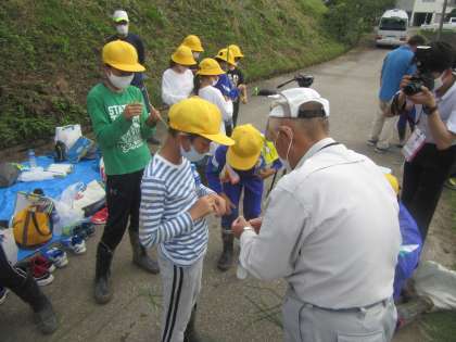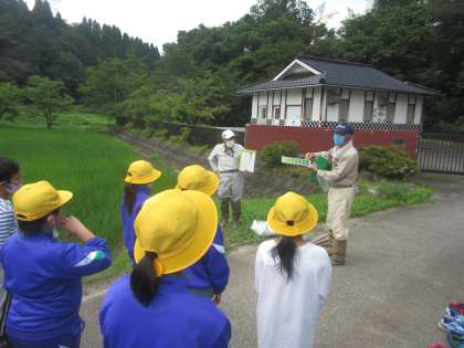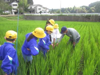 今日は午後から5年生が田んぼに行きました。地域の方に生育調査の方法を教わり、実際に行いました。稲の高さを測ったり一株あたりの本数を数えたりしました。