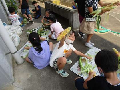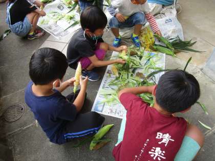 教室外の日陰で、収穫してきたトウモロコシの皮をむきました。「きれい」「先生、虫が・・・」と、教室の外でも大騒ぎでした。