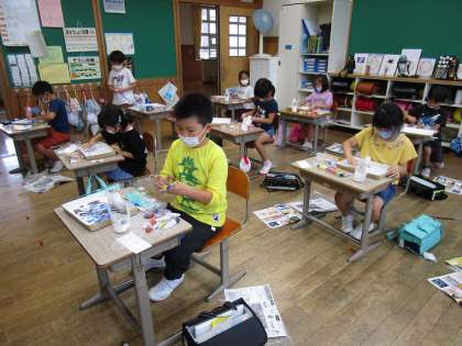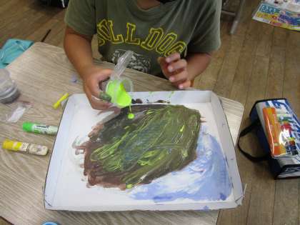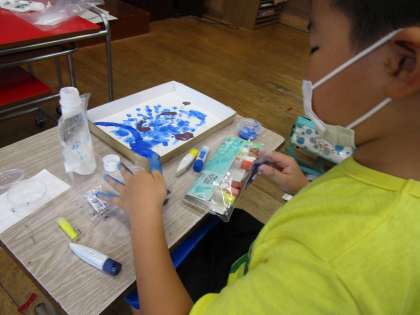 「とろとろえのぐ」で、思い思いに指先や手のひらを使って、絵を描きました。初めは、おそるおそるでしたが、次第に大胆に描きました。