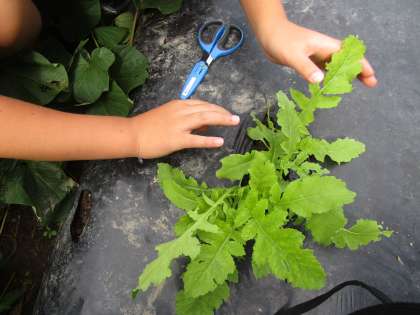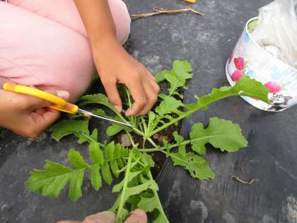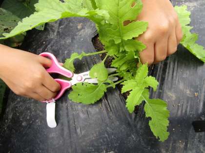 生活科「あきやさいをそだてよう」の学習で、大根の種を蒔きました。大きくなったので、今日は、小さな苗をはさみで切って間引きました。「もう大根ができている」と、小さな「大根」に驚いていましたが、注意深くはさみで切って、苗を1本残すことができました。