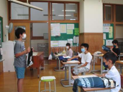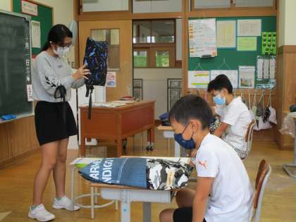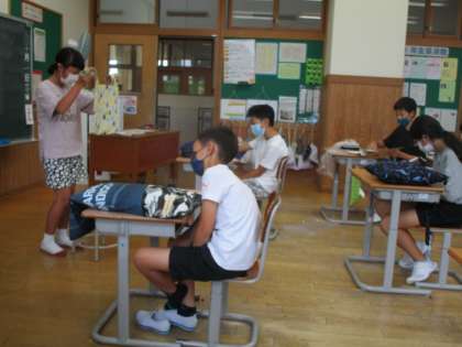 家庭科では家族への贈り物を、ミシンで縫って作製しました。今日の振り返りでは、がんばったことや、工夫点を友達に伝えることができました。