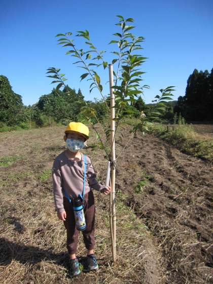4月に植えた桜の苗木を見に行きました。植えたときはただの枝のようだった苗木が大きく育っていて子供たちは嬉しそうでした。近くにはバッタやカマキリもたくさんいてそれにも喜んでいました。