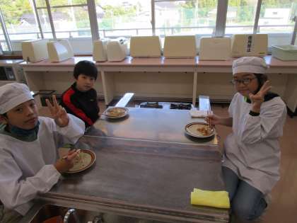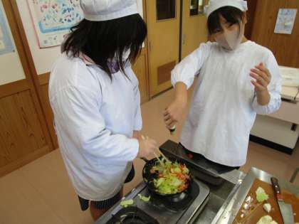 安全に気を付けて調理しました。フライパンで炒めるときは、食材が焦げないように気を付けながら炒めていました。「家でもおかず作りにチャレンジできる」と意気込んでいます。