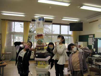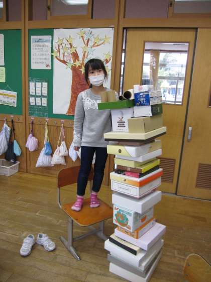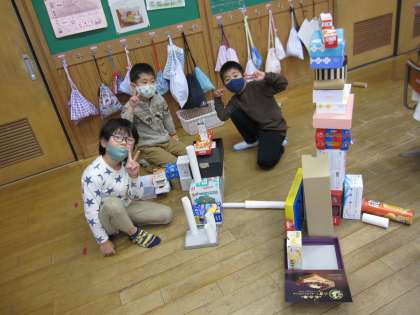 1年生は算数の時間に色々な形の箱で遊びました。色々なものを作ることができました。