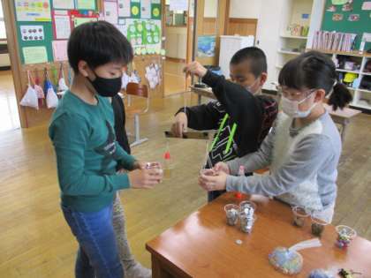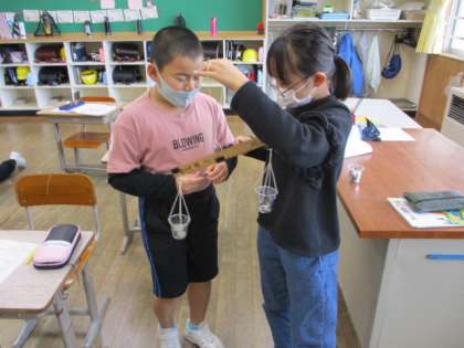 今日は天秤を使って「消しゴムの重さランキング」を付けました。消しゴムを2つずつ比べていくと、ものすごく大変だということに気付き、1円玉やビー玉を使って、「何個分」になるのかを調べました。その後は、のりや鉛筆等、いろいろな物の重さランキングを付けていました。