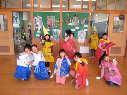 1年生は、学校の周りで拾った葉っぱを使ってすてきな服を作りました。自分たちでビニール袋を切ったり、葉っぱを貼ったりして楽しく作っていました。