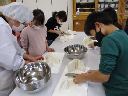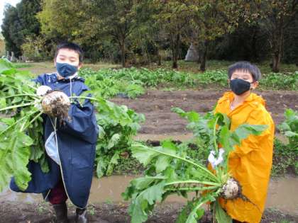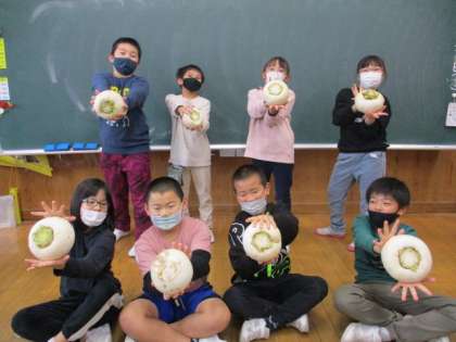 収穫ではあまりの大きさに歓声が上がり、笑顔があふれました。大かぶを包丁で切るときも、みんな上手に包丁を使い、きれいに切っていました。