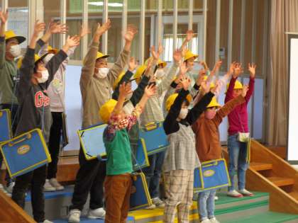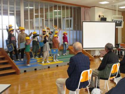感謝の会で、2年生は地域探検したことを「手のひらを太陽に」の替え歌にしたり、道島の美味しい古代米を食べたことを呼びかけで伝えたりしました。