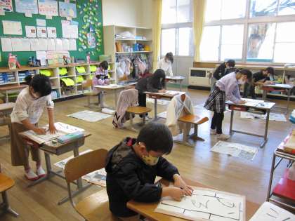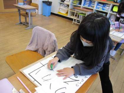 先週から書初練習を始めました。硬筆墨で「かるた」と書いています。太く、濃く、大きな字を目指して集中して練習していました。
