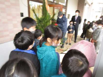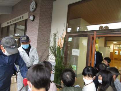 音川交流センターの皆さんが、学校の正面玄関に門松を作ってくださいました。大きな竹、長く伸びた梅や黒文字、真っ赤な実の南天、青々としたたくさんの笹など、道島地区から運んでくださり、立派な門松に組み立ててくださいました。「元気に新年を迎えます」と、お礼の言葉を言いました。