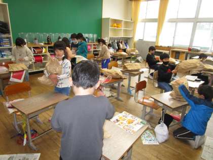 くしゃくしゃにした紙袋を、丸めたり膨らませたりぎゅっとしたりして、作りたいものを考えながら、楽しみました。「ネコ」「サメ」「カメ」「カエル」と、だんだん形が決まっていきました。