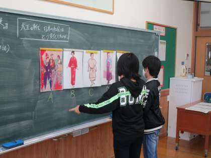 それぞれの時代の服装を、社会的背景を根拠にして考えました。それぞれの時代の特徴を理解しながら学習を進めています。
