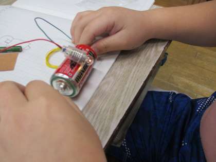 今日は、理科の学習で豆電球を点ける実験をしました。実験道具を配ると、さっと明かりを点ける子供や、いろいろなつなぎ方を試している子供もいました。これからの理科は「電気」を使った実験をしていきます。楽しみですね。