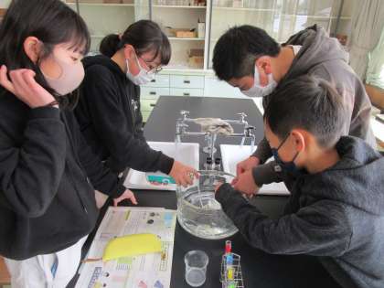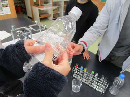 炭酸水に溶けている気体を見付ける実験や、二酸化炭素を水に溶かす実験を行いました。二酸化炭素が溶けたため、ペットボトルがへこむ様子を実際に見て学びました。