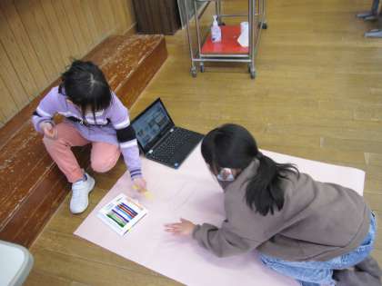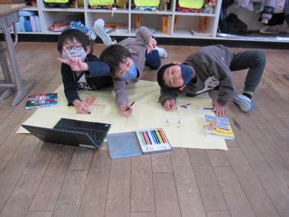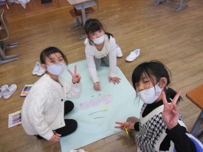 1年生は、2/3の生活科の時間に豆まきをすることにしました。今日は、どうして節分に豆まきをするのかを知り、自分の心のどんな鬼を退治したいか考えました。そして、大きな鬼の絵をグループに分かれて作りました。思ったよりかわいい鬼に仕上がってきて「豆を投げるのがかわいそうになってきた」と話していました。