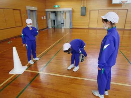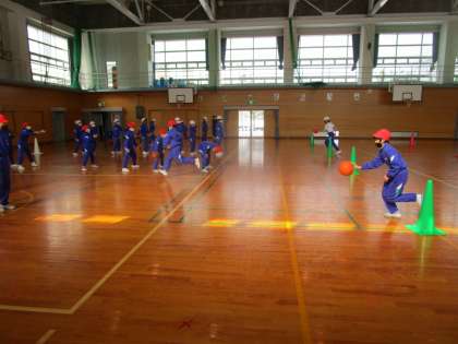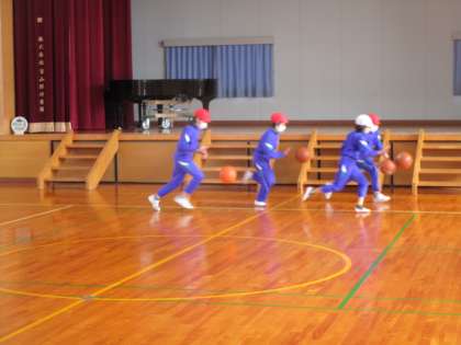 バスケットボールの学習では、ハンドリング、ドリブル、シュートを上手にできるように学習しています。少しでも上手にできるように、一生懸命体を動かしています。