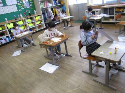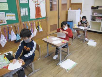 1年生は図工の時間に紙版画を作っています。今日は、髪の毛や首を作りました。「このままだと髪の毛が少なすぎる」「首って意外と太いね」と言いながら作っていました。