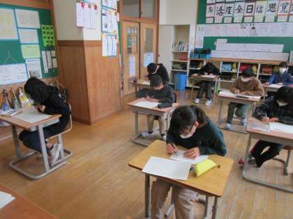 卒業文集の清書をしました。自身の小学校生活を振り返ったり、将来に希望をもったりしながら、丁寧に書きました。