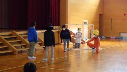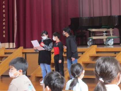 今日の卒業おめでとう集会では、5年生が大活躍でした。出し物係が楽しい劇を考え、会場を盛り上げてくれました。また、クイズ係が学校クイズを出して楽しませてくれたり、プレゼント係がメッセージカードを渡したりと、それぞれの係が役割を果たしました。