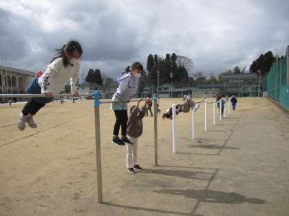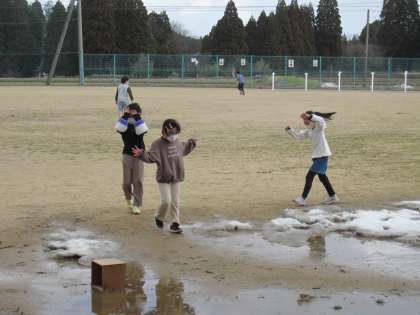 グラウンドの雪がとけました。休み時間に元気よく外へ遊びに行き、広いグラウンドで鬼ごっこや鉄棒を楽しみました。