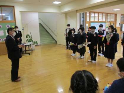 校長先生より、13人全員が卒業証書をいただきました。これまでの思い出や学びを振り返りながら式に参加し、成長した姿を見せることができました。小学校生活で学んだことを、これからの人生で生かしていきましょう。卒業おめでとうございます。
