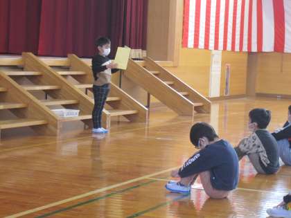 1年生は修了式で、1年間の振り返りの発表をしました。最後に、9人で心を一つにしてハンドベルの演奏をしました。いままでで1番難しい曲でしたが、今までで一番上手に演奏できました。