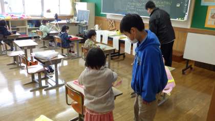 今日は入学してきた1年生と6年生が一緒に活動しました。登校後は朝の準備の仕方を一緒に確認しました。