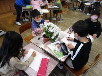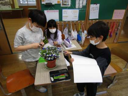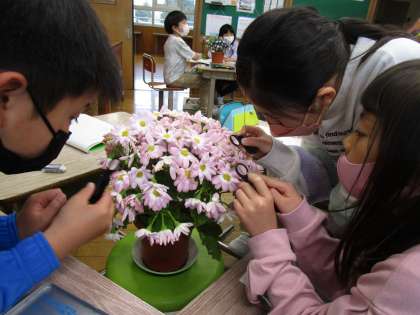 今日はルーペを使って、サイネリアのスケッチをしました。ポイントに気を付け、細かい部位をよく見ながら、スケッチすることができました。