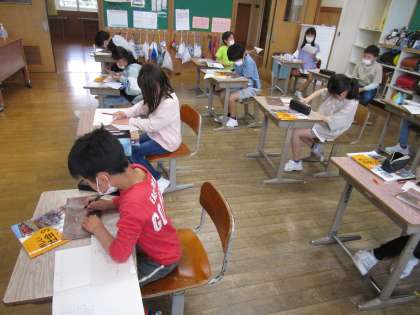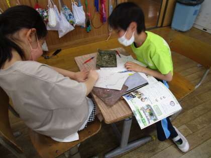 学校のまわりの様子を地図を見ながら調べました。家が集まっている場所を探して、その場所の共通点や理由について考えました。