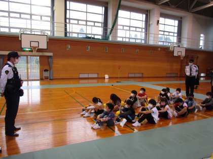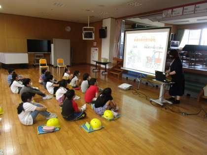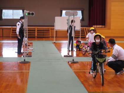 安全な自転車の乗り方を教えていただき、体育館で実際に実践しました。またご家庭でも、安全な自転車の乗り方について、話し合ってみてください。
