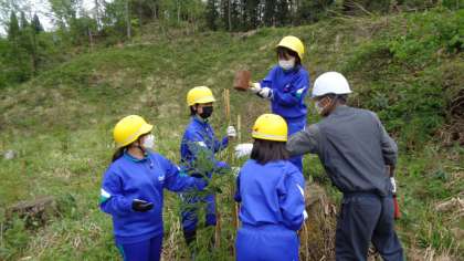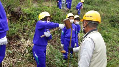 6年生では林業体験をしました。地域の方に教えていただきながら、小さな杉の木に添え木を付ける作業を行いました。たくさんの杉がありましたが、協力しながら作業を進めることができました。