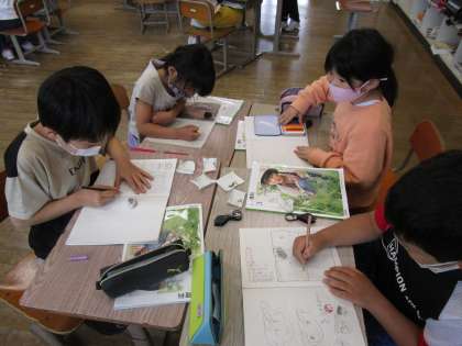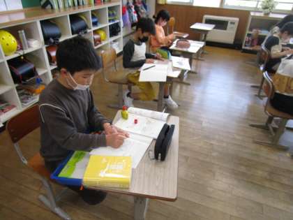 3年生では植物についての学習をしています。今日は五つの種をじっくりと観察し、大きさや形、色等の違いを見付けていました。