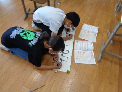 音楽科では、合唱やリズムの学習をしています。八分音符や付点四分音符などの音の長さを確認し、教科書を見ながら、自分たちで音符を書きました。