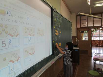 算数科で数字を分ける学習をしています。「いくつといくつに分けられるか」ブロックをつかって、いろいろな組み合わせを見つけています。