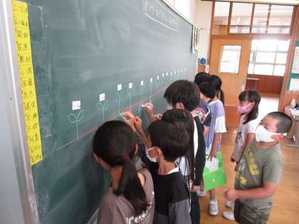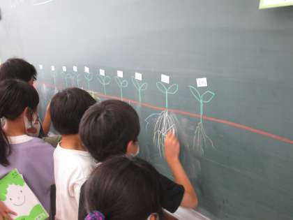 植物は土の中でどのような形をしているのか考えました。根の役割について話し合い、水分や養分を吸収しているのではないかという考えをもちました。実際に根を観察することが楽しみです。