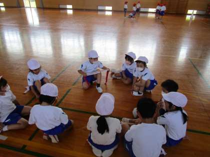 今日は、体育でしっぽ取りを行いました。色団対抗でどうしたら上手く取ることができるか各団で作戦を立てる姿も見られました。