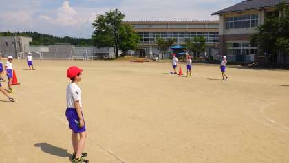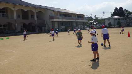 5、6年生ではサッカーの学習を始めました。基本的なパスの練習をした後に、みんなでパスをつないでのシュート練習をしました。どうしたら早くパスをつなぐことができるのかを相談しながら学習を進めることができました。