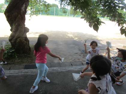 昔から子供たちに親しまれてきた「紙鉄砲」。1年生は、生活科「むかしのあそび」の学習の一環として、マイ紙鉄砲づくりをしました。その後テラスに出て、思い切り腕を振って「パン!」と鳴らして楽しみました。この動きは、ボールを投げる動きと似ているそうです。(ソフトボール投げにつなげていく予定です。)
