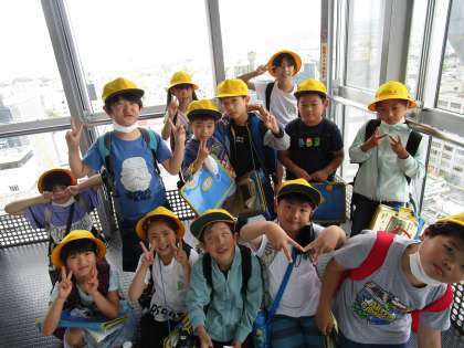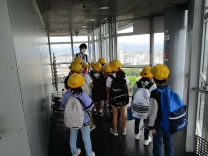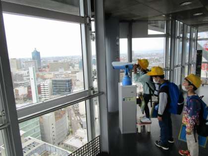 富山市役所展望台では、地上からおよそ70メートルの高さから富山市を見渡しました。社会科で学習した方角を用いて見付けた建物や景色を伝え合ったり、音川小学校の周辺の様子と比較したりしました。