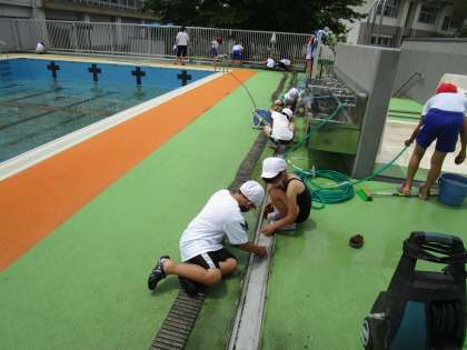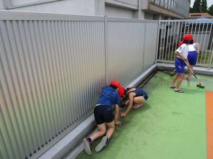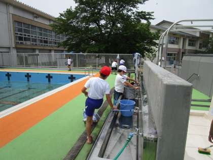 3、4年生の力を合わせてプールの溝の汚れを取ったり、プールサイドを磨いたりしました。プール開きに向けて、一生懸命がんばっていました。