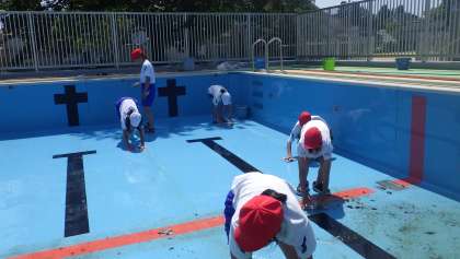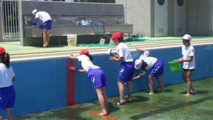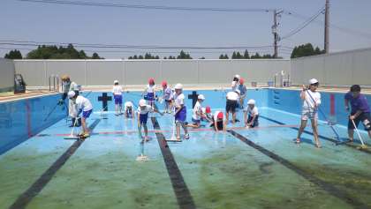 今日は5、6年生がプール清掃をしました。みんなで協力して、プールの中をぴかぴかにすることができました。子供たちが一生懸命掃除をしてくれたおかげで、予定よりも早く終わりました。