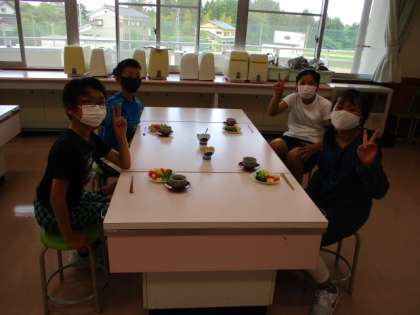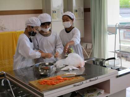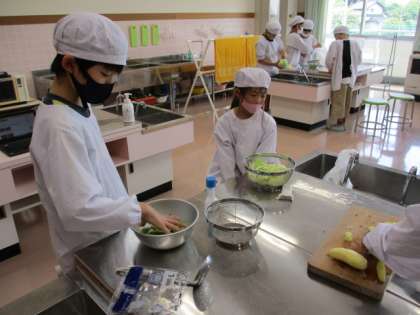 今日は3回目の調理実習で、ゆで野菜サラダをつくりました。今回は班ごとに野菜を三つまで決め、ドレッシングも自分たちでつくりました。どの班も上手につくっていました。