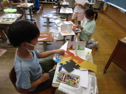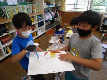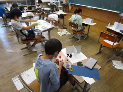 くるくる回る仕組みを動かしながら、作品をつくっています。表したいことを見付け、形や色、材料を考えながら学習を進めています。