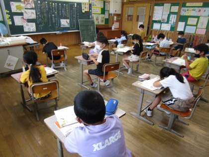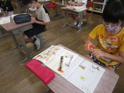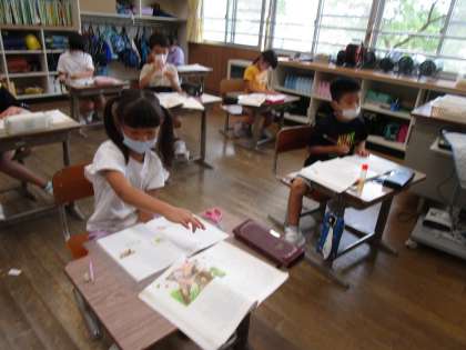 主人公の気持ちの変化を考えています。今日は、主人公に影響を与えた出来事や、教科書の挿絵を根拠の中心にしながら考えました。