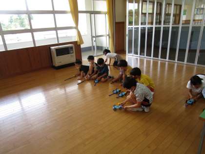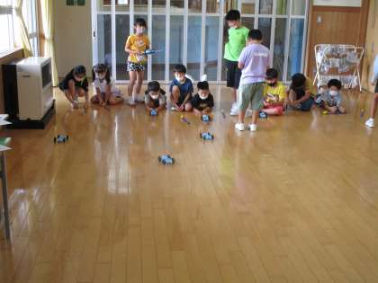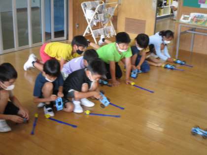今日は、ゴムの力を利用して車を動かしました。より遠くに動かす方法を考えながら学習し、その仮説を証明するための実験を考えていきます。